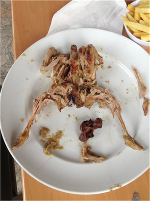 De ober kwam en haalde met een groots gebaar het servet van mijn kip. Ik keek. En keek nog een keer. En deed een schietgebed.
