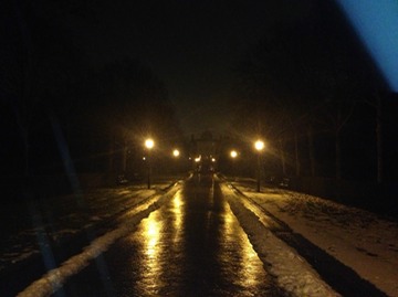 Er was nu geen hond, zelfs geen straatlantaarn. Mijn miezerige fietslichtje had weinig effect. Dat de dooi nog niet tot het Haagse Bos was doorgedrongen, merkte ik toen mijn voorwiel plots weg glibberde, ik slipte, met een voet nog probeerde wat evenwicht te krijgen, maar daar niet in slaagde, zodat ik opeens met mijn kont op nat, glibberig ijs zat.