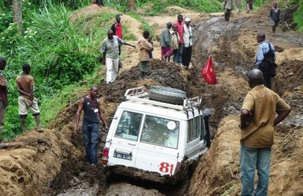 Toen wij de volgende ochtend uiteindelijk om 13.00 uur konden vertrekken, vreesde ik het ergste. Zeker toen wij na nog geen 5 kilometer in een diepe geul met modder en water terecht kwamen die recht op een ravijn afging. De chauffeur verloor volledig de controle. (Nee, ik zag niet in een seconde mijn leven voorbij razen). Een grote steen redde ons leven (denk ik). Uiteindelijk bereikten we na 6,5 uur de bewoonde wereld (Sake), maar deden we er vervolgens nog 1,5 uur over om Goma te bereiken. Mijn mede-reisgenoten wilden kaas, melk en groenten. De chauffeur wilde een wasbeurt voor de onherkenbare jeep en iedereen begroette iedereen en begon een praatje.