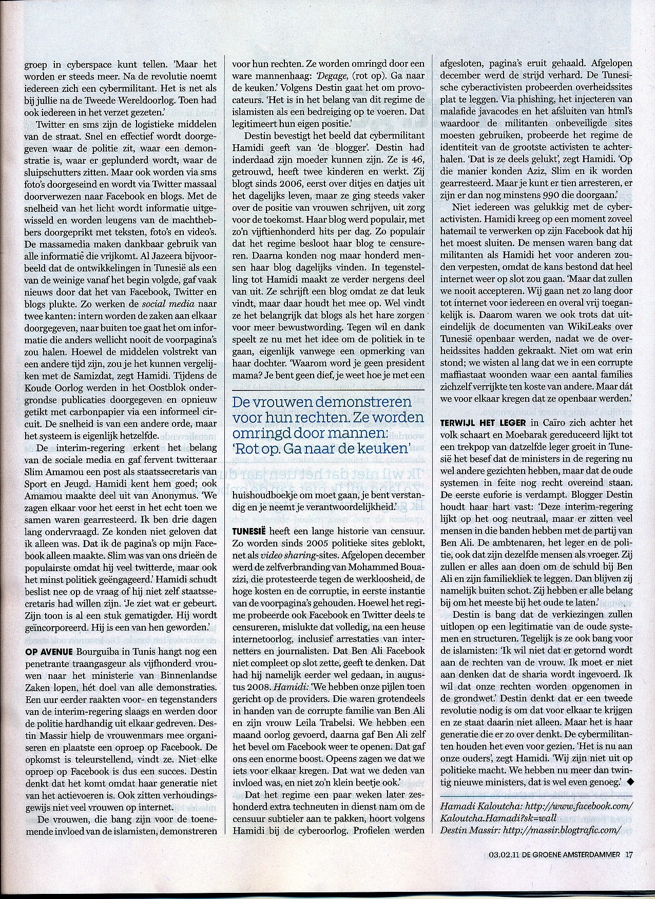 Dictator dumpen in 140 tekens, pag. 1, Groene Amsterdammer, 3 febr. 2011